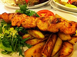 ไก่ย่างเสียบไม้ สไตล์กรีก จานนี้มาพร้อมกับมันฝรั่งทอด