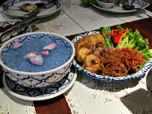 “ข้าวแช่ชาววัง” ที่ร้านใช้สีม่วงอมฟ้าจากดอกอัญชัญ