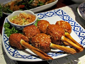“ไก่ห่อตะไคร้” คือ เนื้อไก่หุ้มก้านตะไคร้ โรยด้วยงาขาวนิดๆ