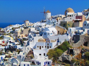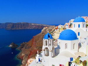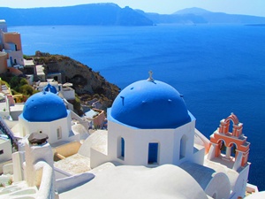 โบสถ์สีขาว โดมสีฟ้า เป็นสัญลักษณ์อันโดดเด่นของเกาะซานโตรินี่